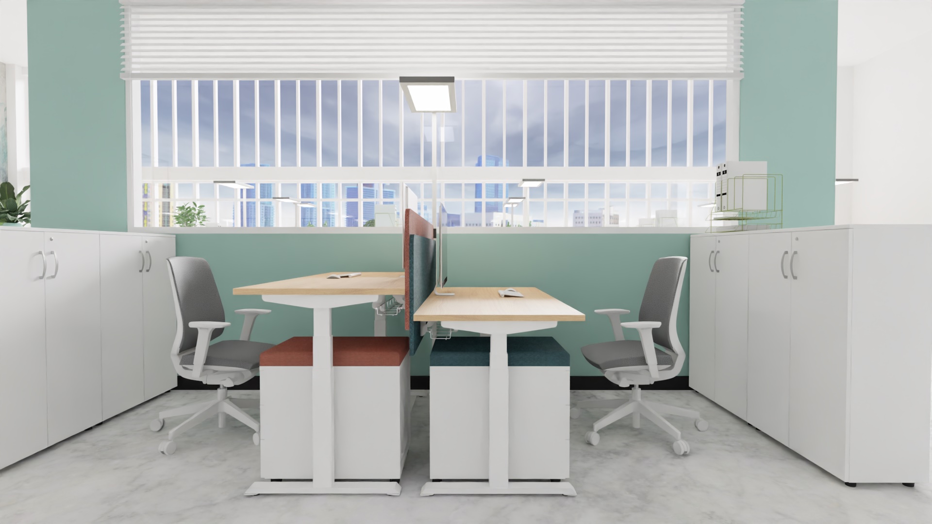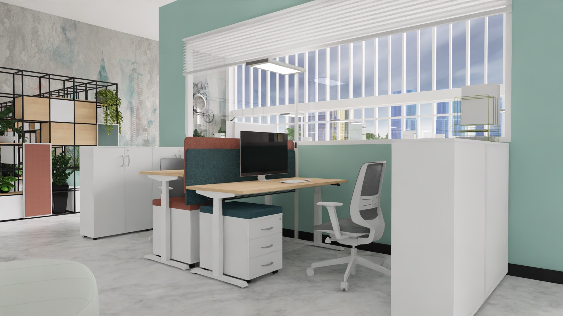 | MARO Op-Lite E Lano-E 300 T Bench jest stanowiskiem wieloosobowym z elektryczną regulacją wysokości blatu, które pozwoli użytkownikom wielokrotnie zmieniać pozycję podczas pracy. To ergonomiczne stanowisko pracy charakteryzuje się klasyczną nogą o wyglądzie odwróconej litery T. Cechą charakterystyczną stanowisk wieloosobowych zbudowanych na bazie tego typu stelaża jest łatwe łączenie i rozłączanie biurek, co jest szczególnie ważne w przypadku dynamicznie zmieniających się zespołach projektowych, przy wielokrotnej rearanżacji wnętrza. |  |