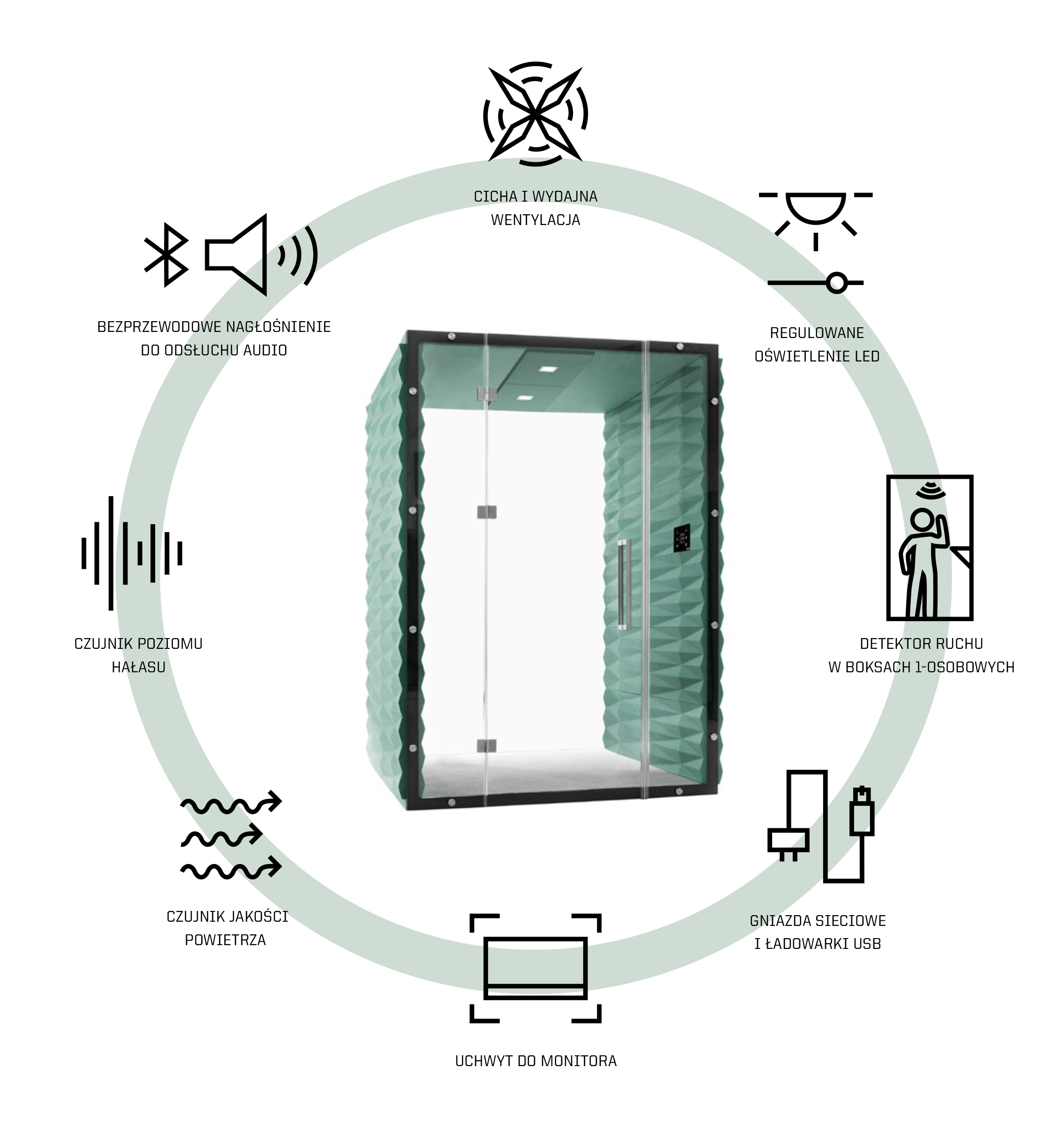 |  | Akustyka Vank Box 6-osobowyKorpus boksu o specjalnej konstrukcji warstwowej pozwala na izolacyjność stanowiska od otaczającego środowiska. Tkaniny i wykładzina o właściwościach akustycznych absorbują dźwięki wewnątrz, zapewniając komfort podczas rozmów. Istnieje możliwość wykonania w różnych kolorach tkanin o wysokich parametrach użytkowych, w ramach jednego rodzaju materiału. |