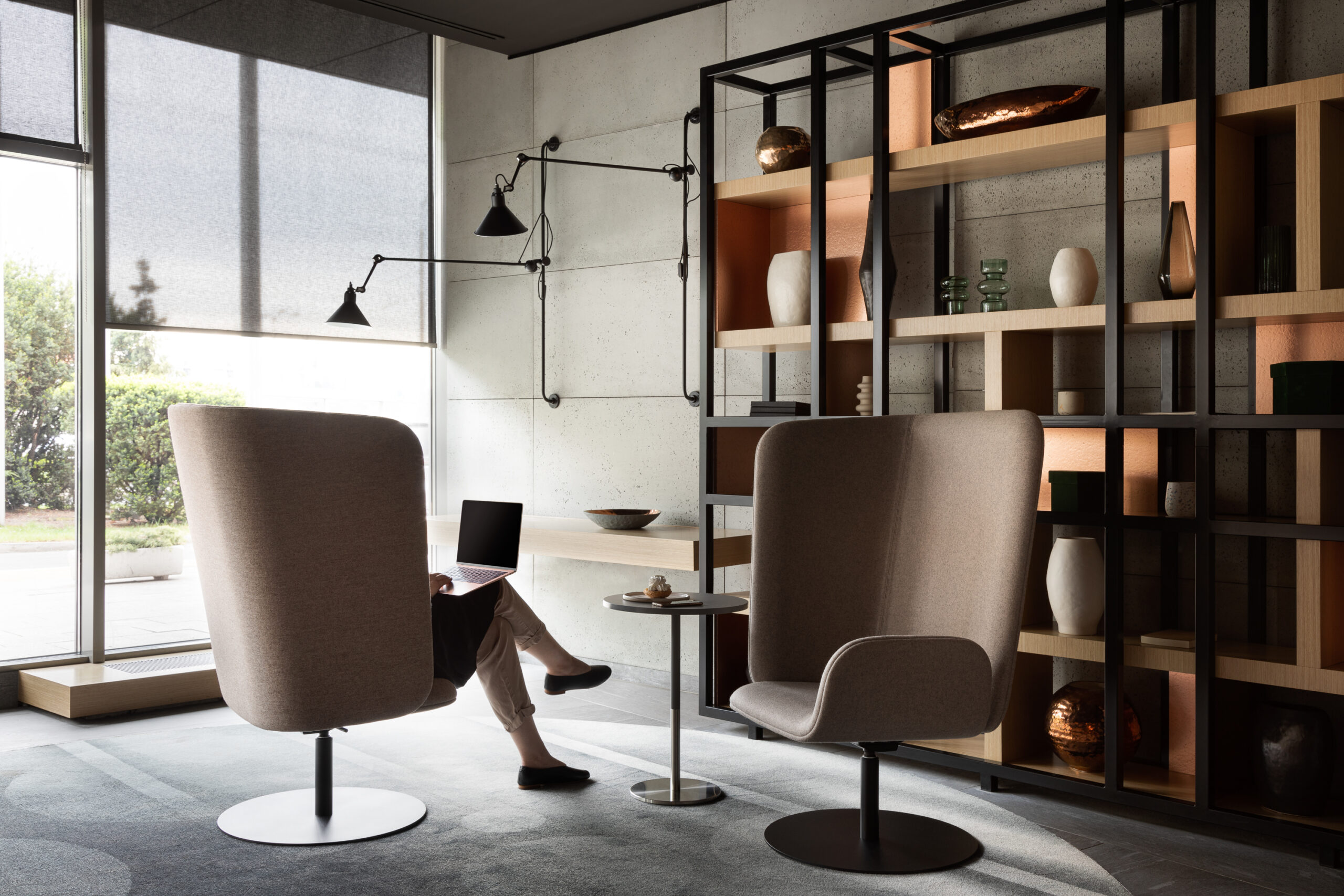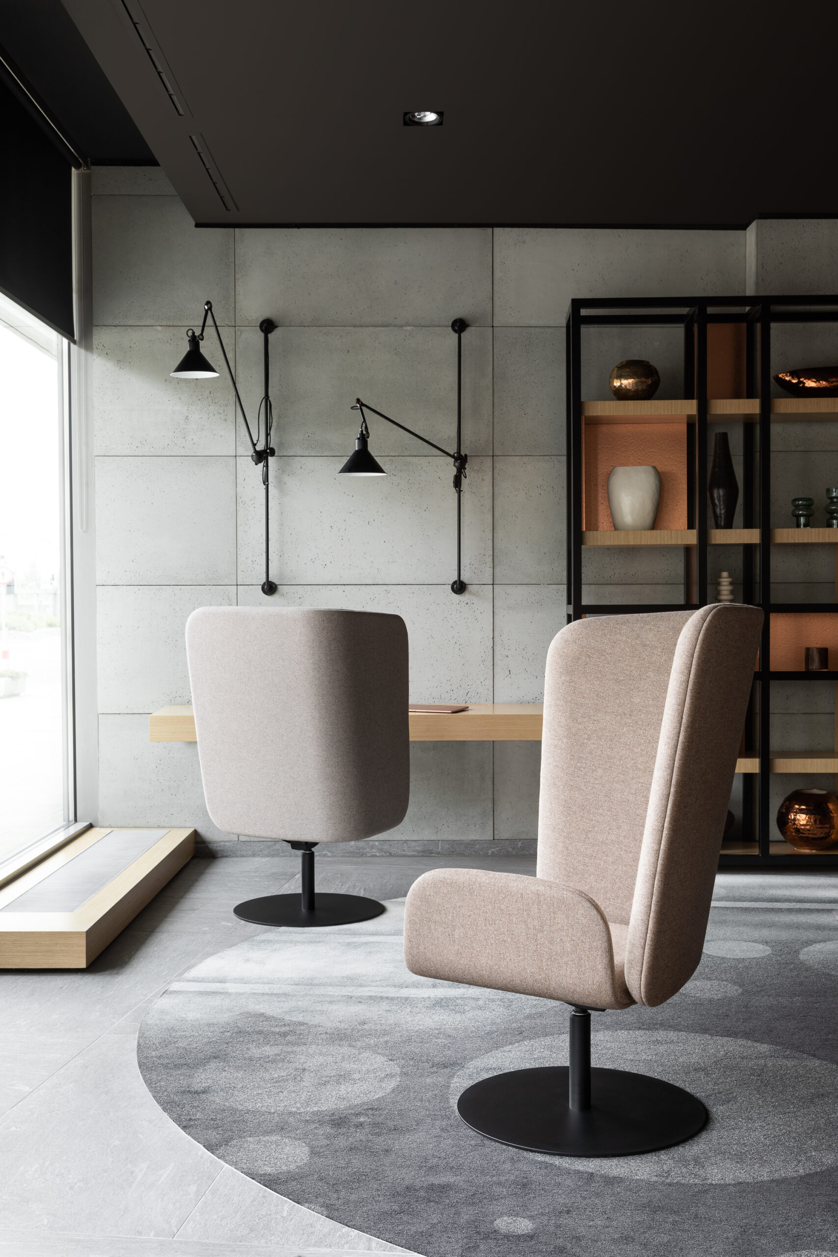 | Noti Shieldon Shieldon to doskonałe rozwiązanie do zastosowań komercyjnych, gdzie istotne jest utrzymanie odpowiedniego dystansu między stanowiskami w przestrzeni wspólnej. Doskonale sprawdzi się w wnętrzach hotelowych, korporacyjnych, tworząc lobby, miejsca spotkań czy przestrzenie wypoczynkowe w sposób bezpieczny i komfortowy. Ten projekt autorstwa Tomka Rygalika stanowi również doskonałe rozwiązanie do prywatnych mieszkań, pozwalając na częściowe wydzielenie się z otwartej przestrzeni domowej dzięki swojej formie. Fotel jest dostępny w dwóch wariantach: z prawym lub lewym wysokim oparciem, co umożliwia elastyczne dostosowanie go do istniejących przestrzeni. Siedzisko z możliwością odchylania i obracania dostosowuje się do preferencji użytkownika, zapewniając wysoki komfort użytkowania. Dzięki temu Shieldon jest wszechstronnym meblem, który można dostosować zarówno do potrzeb komercyjnych, jak i indywidualnych. |  |