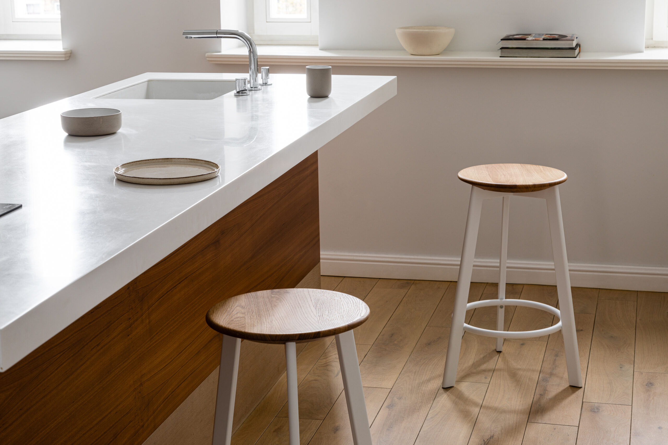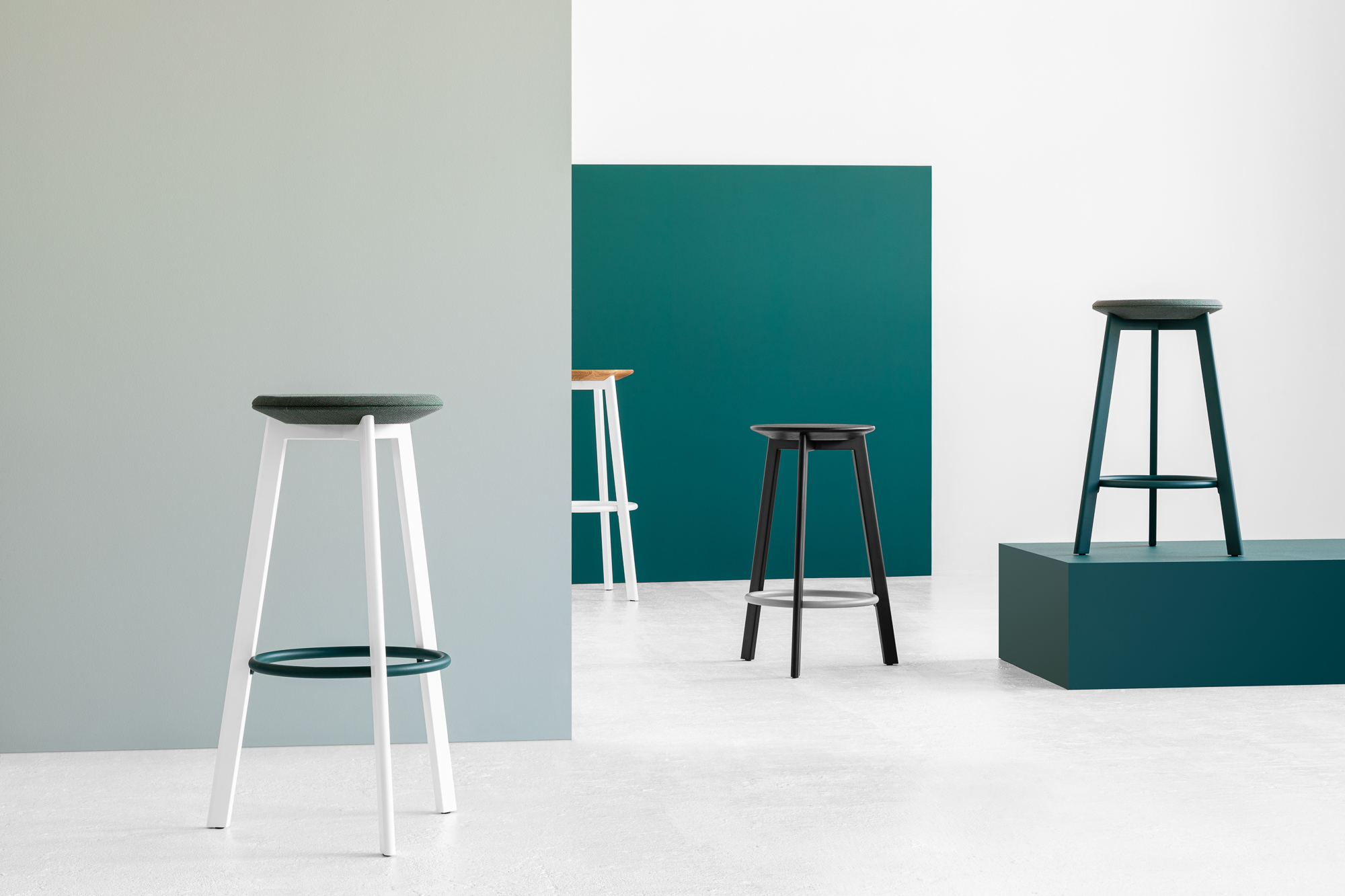 | Cechy Podstawa – Stalowe nogi lakierowane, obręcz stalowa — możliwość łączenia kolorów Siedzisko – Drewno dębowe lakierowane lub pianka poliuretanowa tapicerowana Wykończenie – Tkanina, skóra |