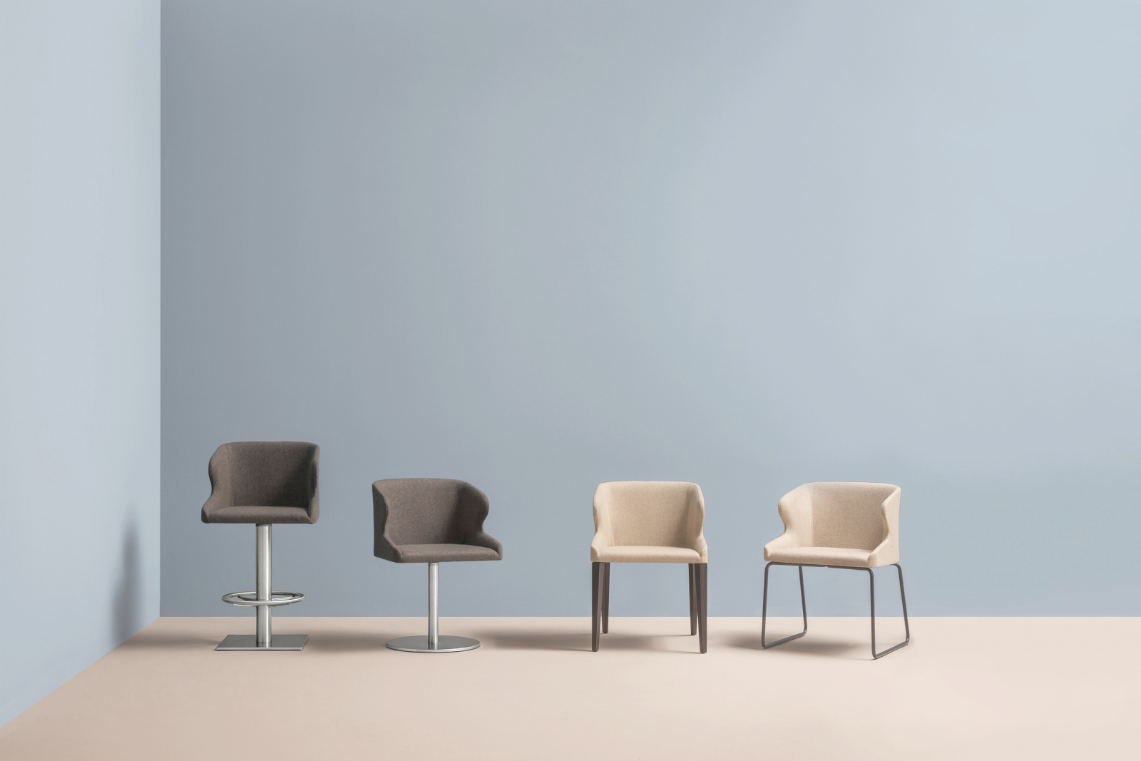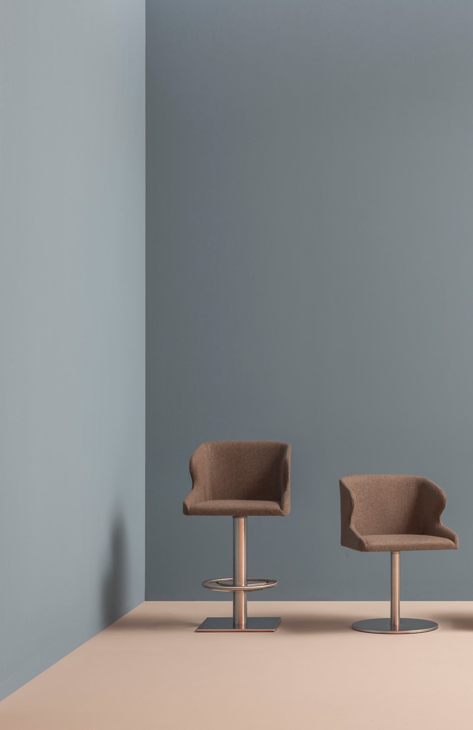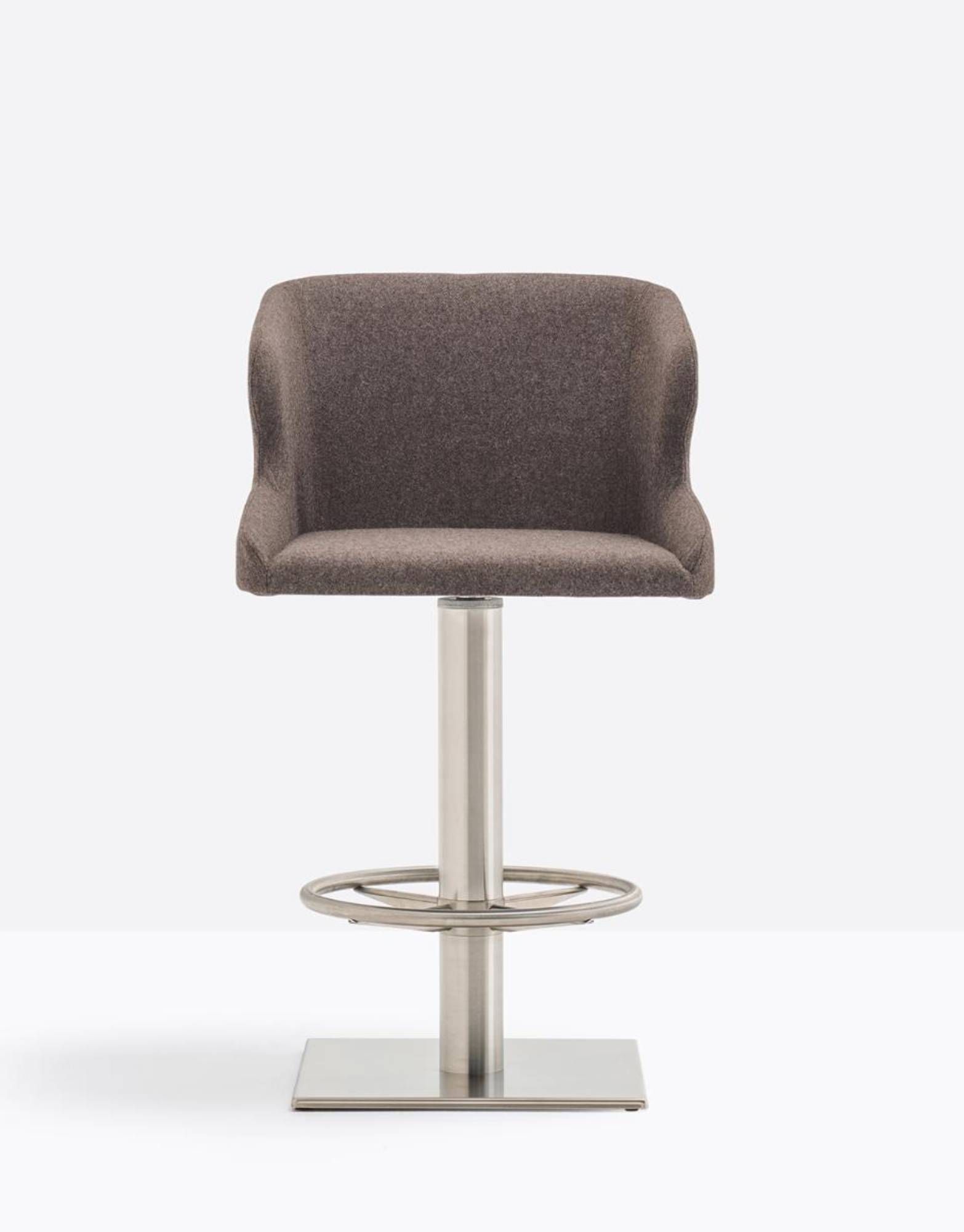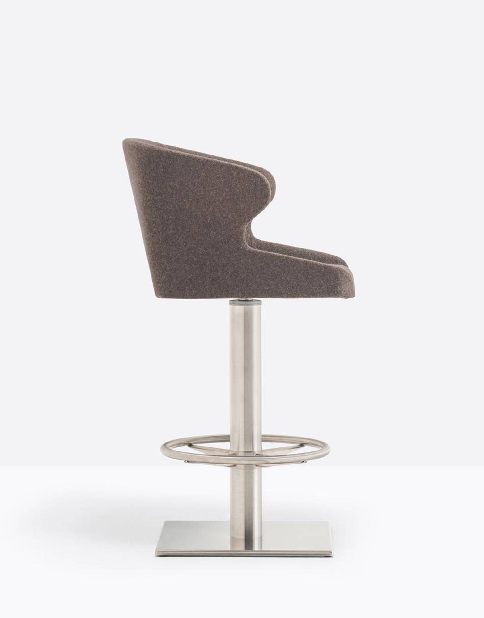 Pedrali Leila 687 Leila 687 to elegancki hoker. Posiada wewnętrzną strukturę ze stali oraz wygodne siedzisko z giętym piankowym poliuretanem obite tkaniną, dostępną w różnych kategoriach. Metalowa kolumna z mechanizmem obrotowym. Podnóżek z czterema ramionami wykonany z nierdzewnej stali. Idealny do użytku komercyjnego jak i prywatnego.