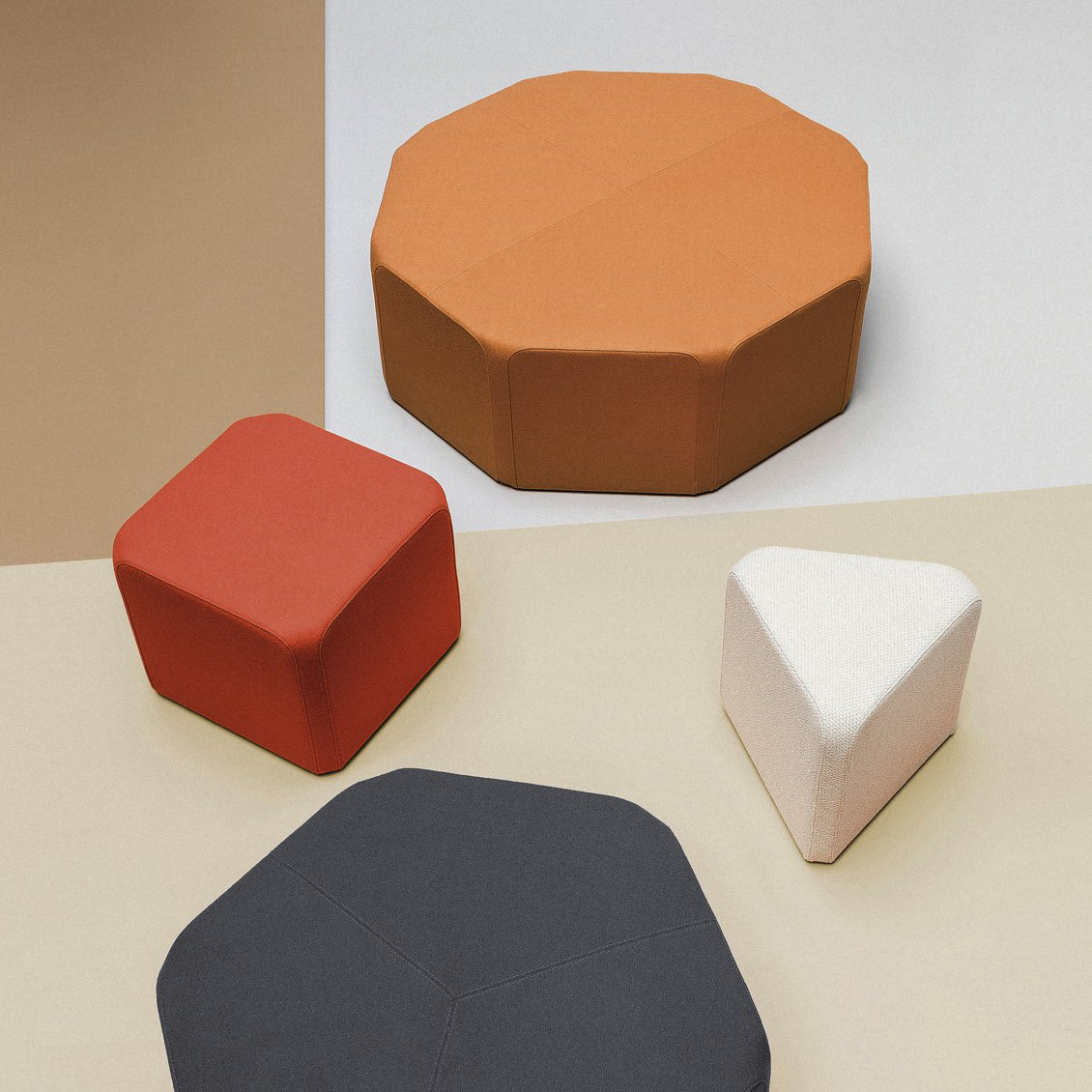 | Noti x40 Rodzina puf x40 składa się z czterech siedzisk o wielokątnych podstawach: trójkąta, kwadratu, sześciokąta i ośmiokąta. Kształtki styropianowe pokryte pianką poliuretanową sprawiają, że pufy są niezwykle lekkie, zachęcając do częstego przestawiania. Wszystkie bryły posiadają identyczny prostokątny element o szerokości 40 cm i zaokrąglonych narożnikach, co umożliwia tworzenie różnorodnych konfiguracji. Bogactwo kolorów tkanin Noti dodaje możliwości personalizacji. x40 doskonale sprawdza się zarówno w miejscach publicznych, jak i nowoczesnych przestrzeniach mieszkalnych. |  |