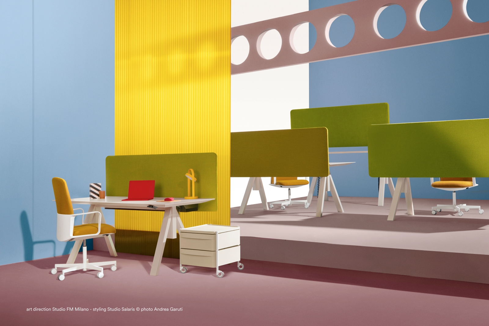 Pedrali ARKI-TABLE ARK Dzięki praktycznemu blatowi z regulacją wysokości, regulowane biurko Arki-Table przyczynia się do stworzenia funkcjonalnej i dynamicznej przestrzeni biurowej. Pojedyncza stacja robocza ze stalowymi nogami kozłowymi i blatem wspartym na wytłaczanej aluminiowej ramie. Dwa siłowniki elektryczne, połączone z jednostką sterującą i uruchamiane za pomocą sterownika umieszczonego pod blatem, poruszają się jak jeden, co pozwala użytkownikowi wybrać idealną wysokość blatu od 740 do 1140mm. Przepust kablowy umieszczony między blatem a panelem, umożliwia zakotwiczenie panelu dźwiękochłonnego obitego tkaniną, który oddziela jedno biurko od drugiego. |