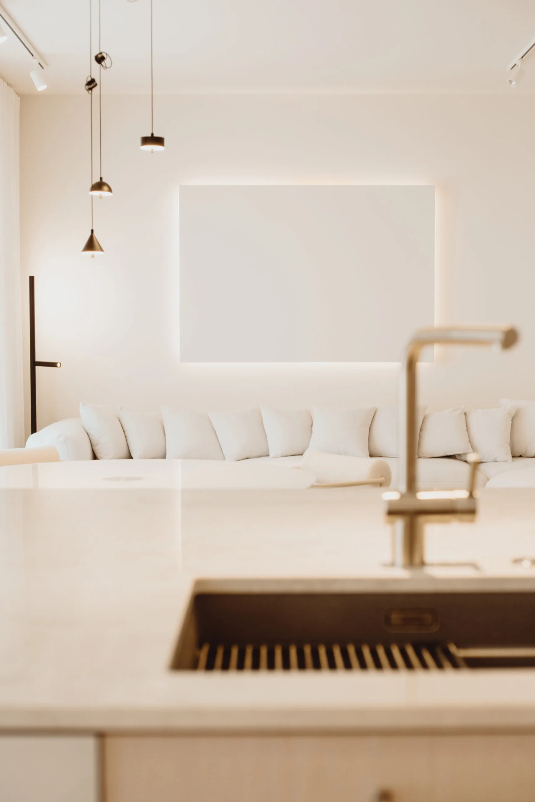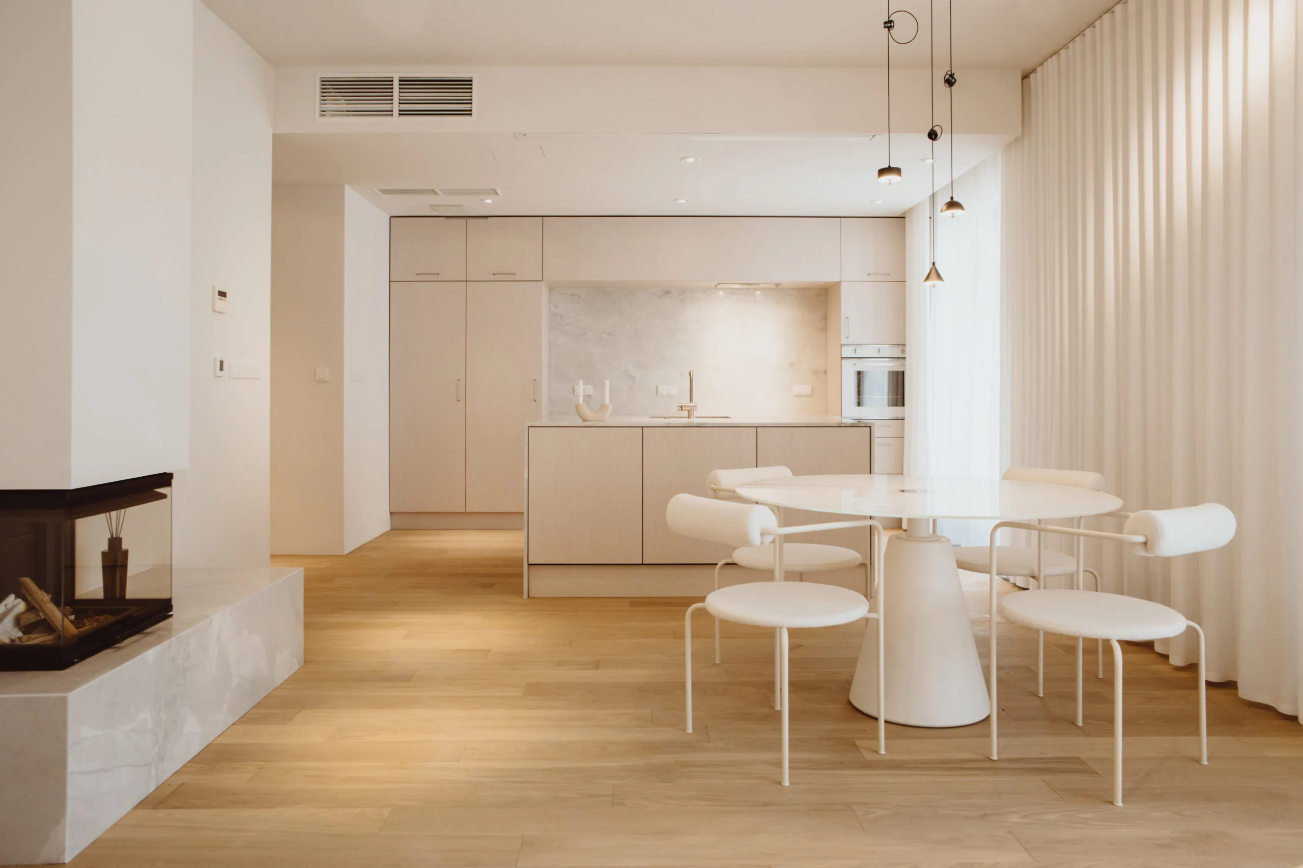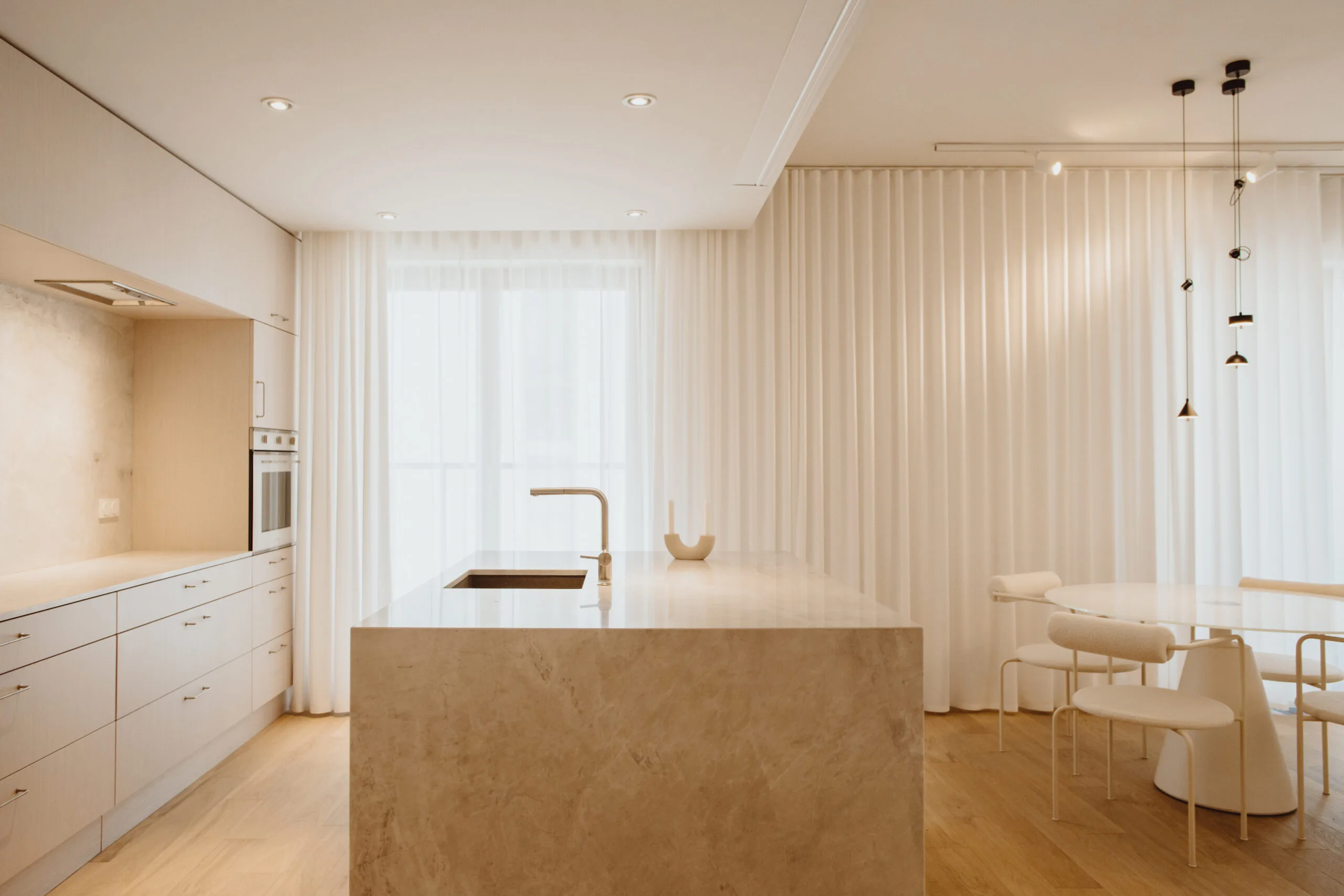 Dzięki współpracy z firmą Arche wyposażyliśmy powierzchnię w zabudowy pod wymiar. W lokalu zastosowano naturalne materiały jak kamień czy naturalny fornir. Mimo iż lokal ma ponad 100m2 to dodatkowo został powiększony wyborem jasnych kolorów oraz zabudowami ukrytymi za płaszczyznami z luster. Motywem przewodnim był minimalizm oraz niecodzienne rozwiązania, dzięki czemu lokal zadziwia i zachwyca każdego użytkownika.
