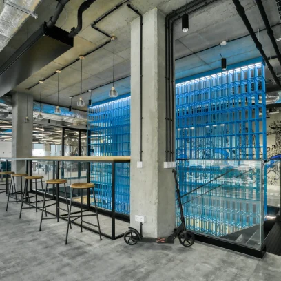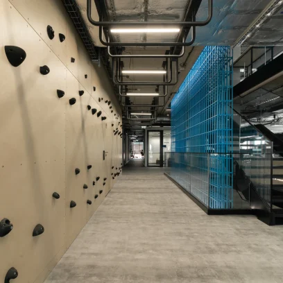 Biuro zostało nasycone dużą ilością „surowych” materiałów takich jak sklejka, beton czy skóra. W elementy metalowe i meble tapicerowane została wpleciona kolorystyka firmy Qualtrics. Powierzchnia kryje w sobie takie przestrzenie jak chillout stylizowany na skatepark, ścianki wspinaczkowe, siłownię, yoga room czy jedną z kuchni stylizowaną na salon gier. Biuro nie tylko idealne jest do pracy, ale również do zwiedzania i odkrywania różnych smaczków i zakamarków.