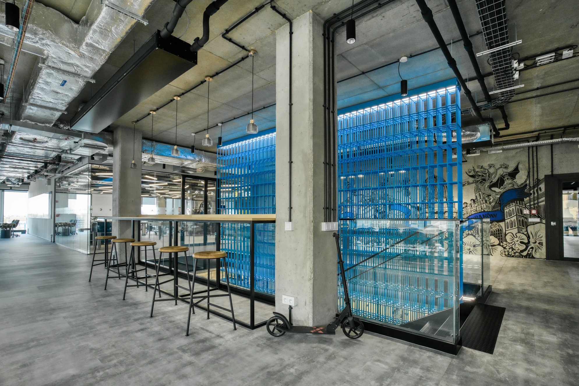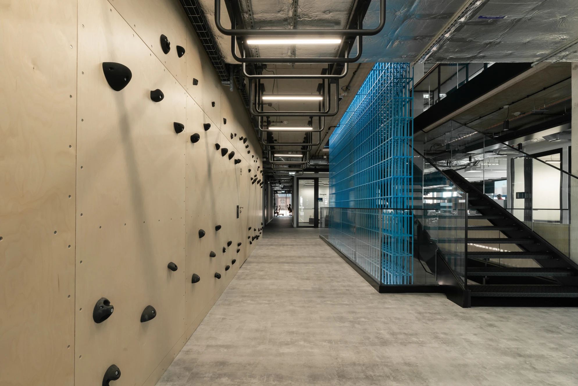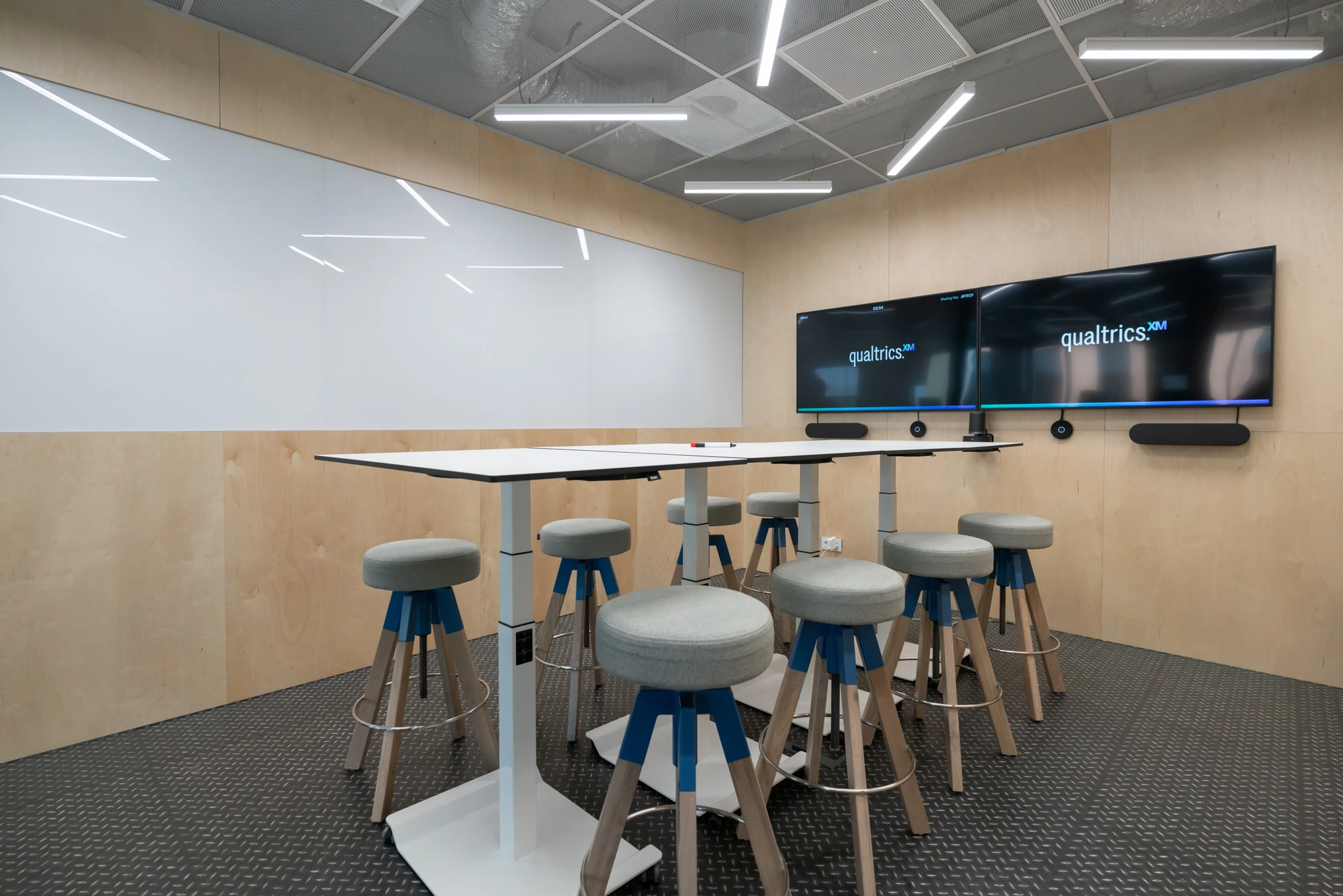 Biuro zostało nasycone dużą ilością „surowych” materiałów takich jak sklejka, beton czy skóra. W elementy metalowe i meble tapicerowane została wpleciona kolorystyka firmy Qualtrics. Powierzchnia kryje w sobie takie przestrzenie jak chillout stylizowany na skatepark, ścianki wspinaczkowe, siłownię, yoga room czy jedną z kuchni stylizowaną na salon gier. Biuro nie tylko idealne jest do pracy, ale również do zwiedzania i odkrywania różnych smaczków i zakamarków.