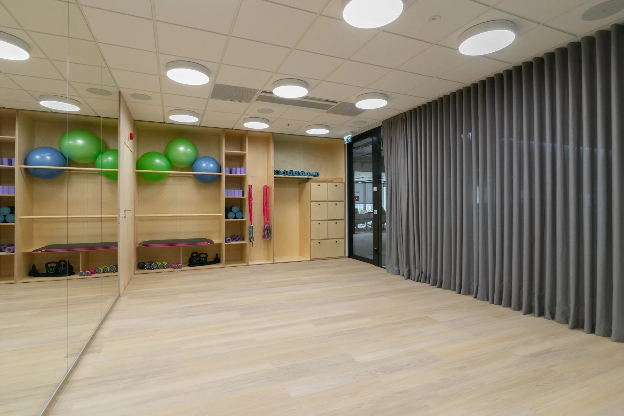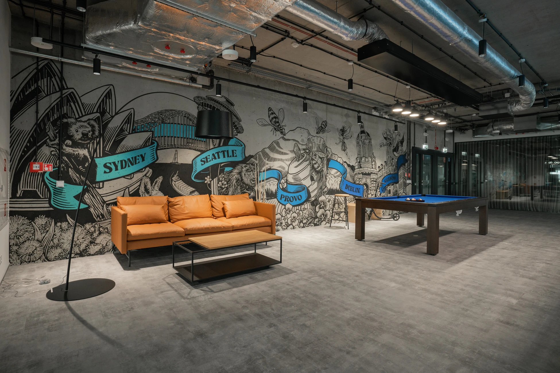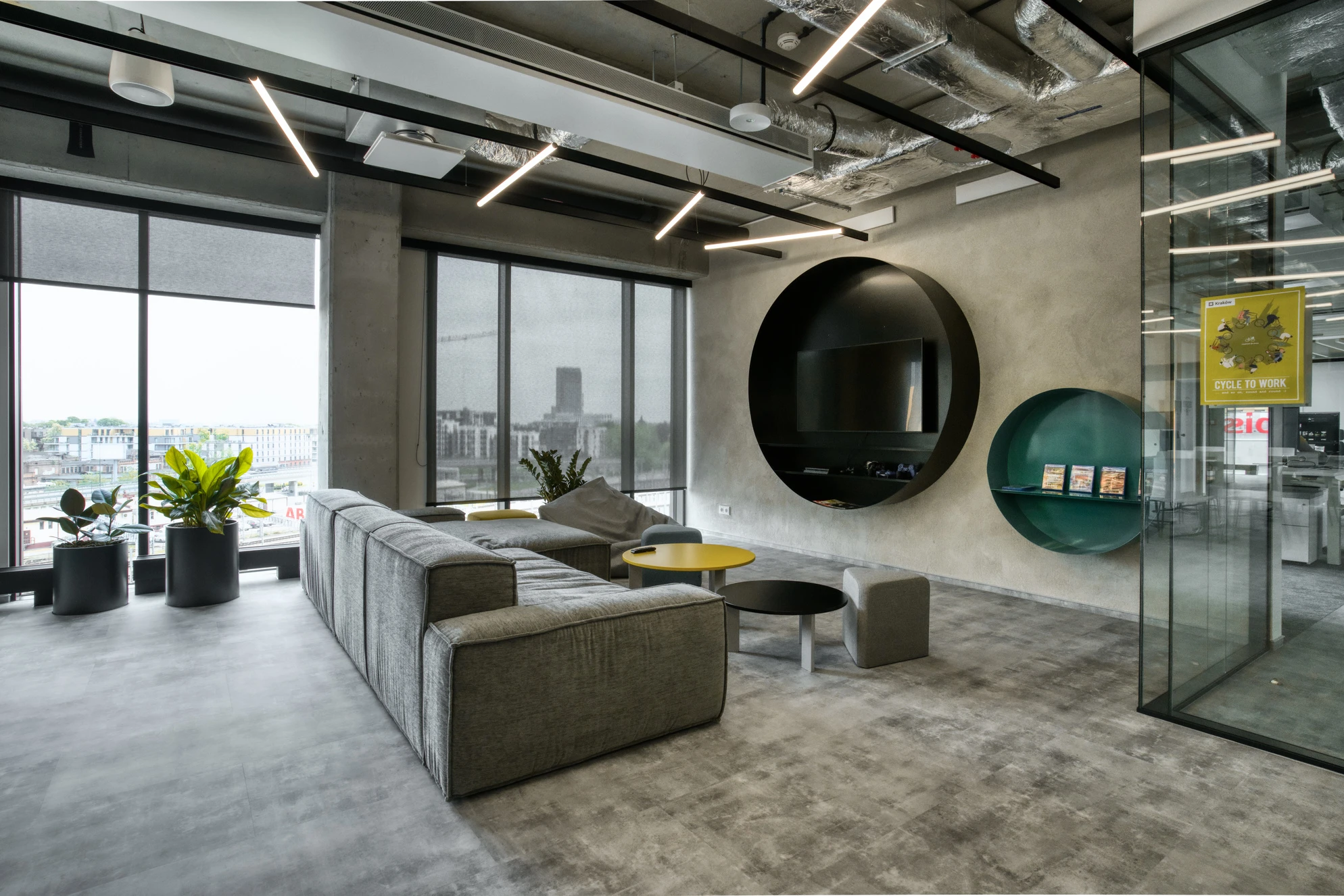 Biuro zostało nasycone dużą ilością „surowych” materiałów takich jak sklejka, beton czy skóra. W elementy metalowe i meble tapicerowane została wpleciona kolorystyka firmy Qualtrics. Powierzchnia kryje w sobie takie przestrzenie jak chillout stylizowany na skatepark, ścianki wspinaczkowe, siłownię, yoga room czy jedną z kuchni stylizowaną na salon gier. Biuro nie tylko idealne jest do pracy, ale również do zwiedzania i odkrywania różnych smaczków i zakamarków.