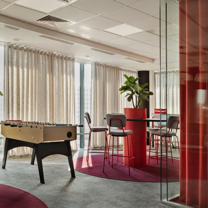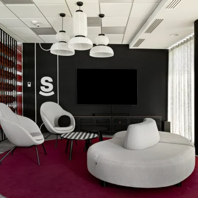 Przytulną, niemal domową atmosferę tworzą rośliny, miękkie tkaniny i pofalowane zasłony, które równoważą dynamiczny charakter przestrzeni. Duży nacisk położono także na strefy relaksu – w biurze znalazły się m.in. piłkarzyki, rzutki, piłki, wygodne fotele i sofy, które sprzyjają odpoczynkowi i integracji pracowników.