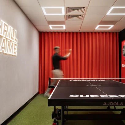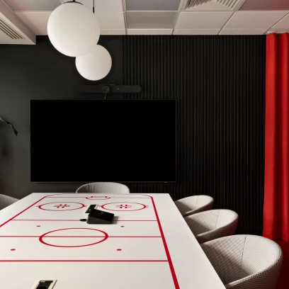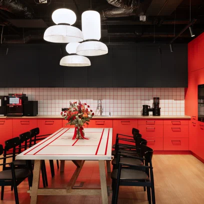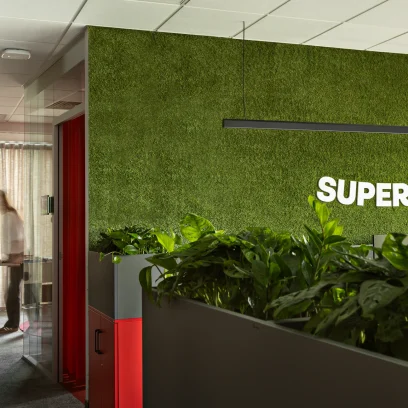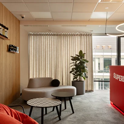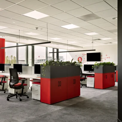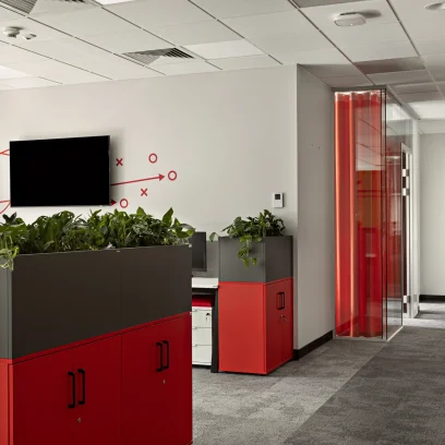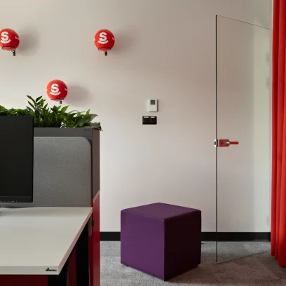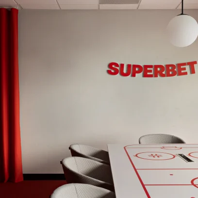 Ciekawym akcentem są grafiki – nie tylko na ścianach, ale również na blatach stołów i frontach szaf, które wzmacniają wizualną tożsamość marki. Dominującym motywem kolorystycznym jest czerwień – kolor logotypu Superbet, subtelnie przewijający się w różnych częściach biura.