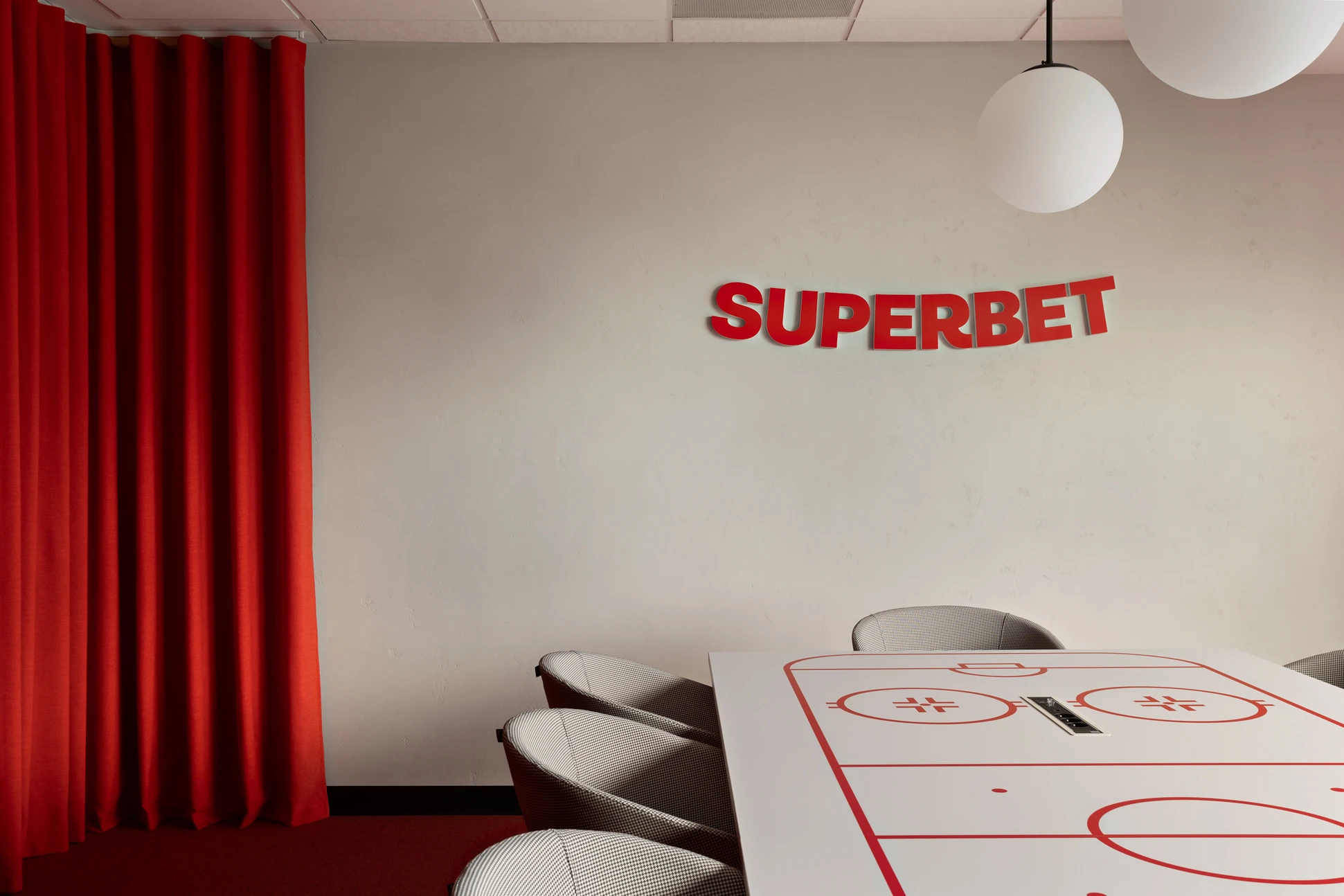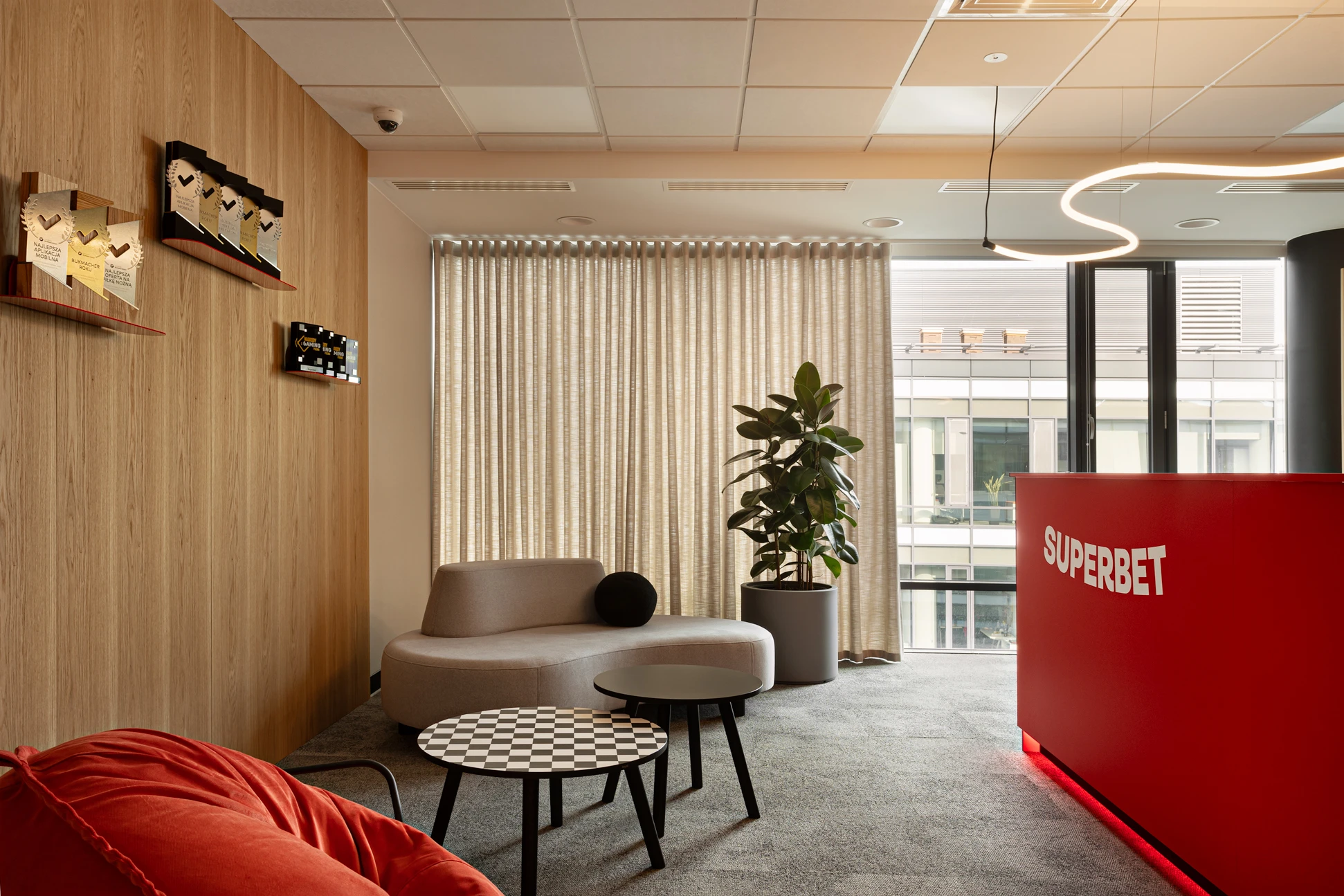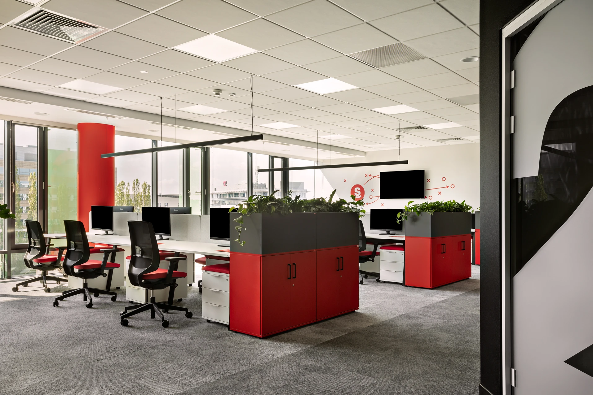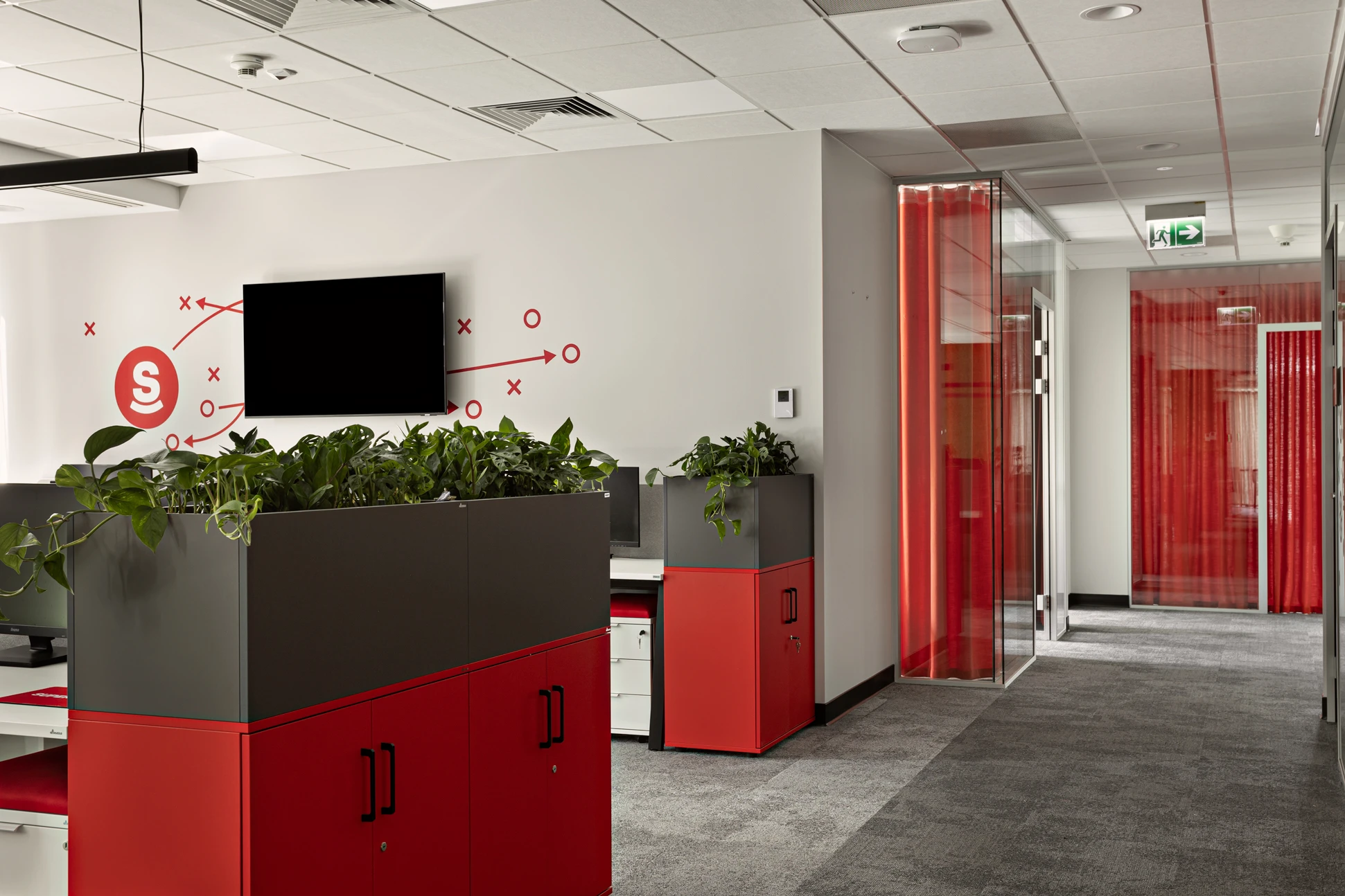 Ciekawym akcentem są grafiki – nie tylko na ścianach, ale również na blatach stołów i frontach szaf, które wzmacniają wizualną tożsamość marki. Dominującym motywem kolorystycznym jest czerwień – kolor logotypu Superbet, subtelnie przewijający się w różnych częściach biura.