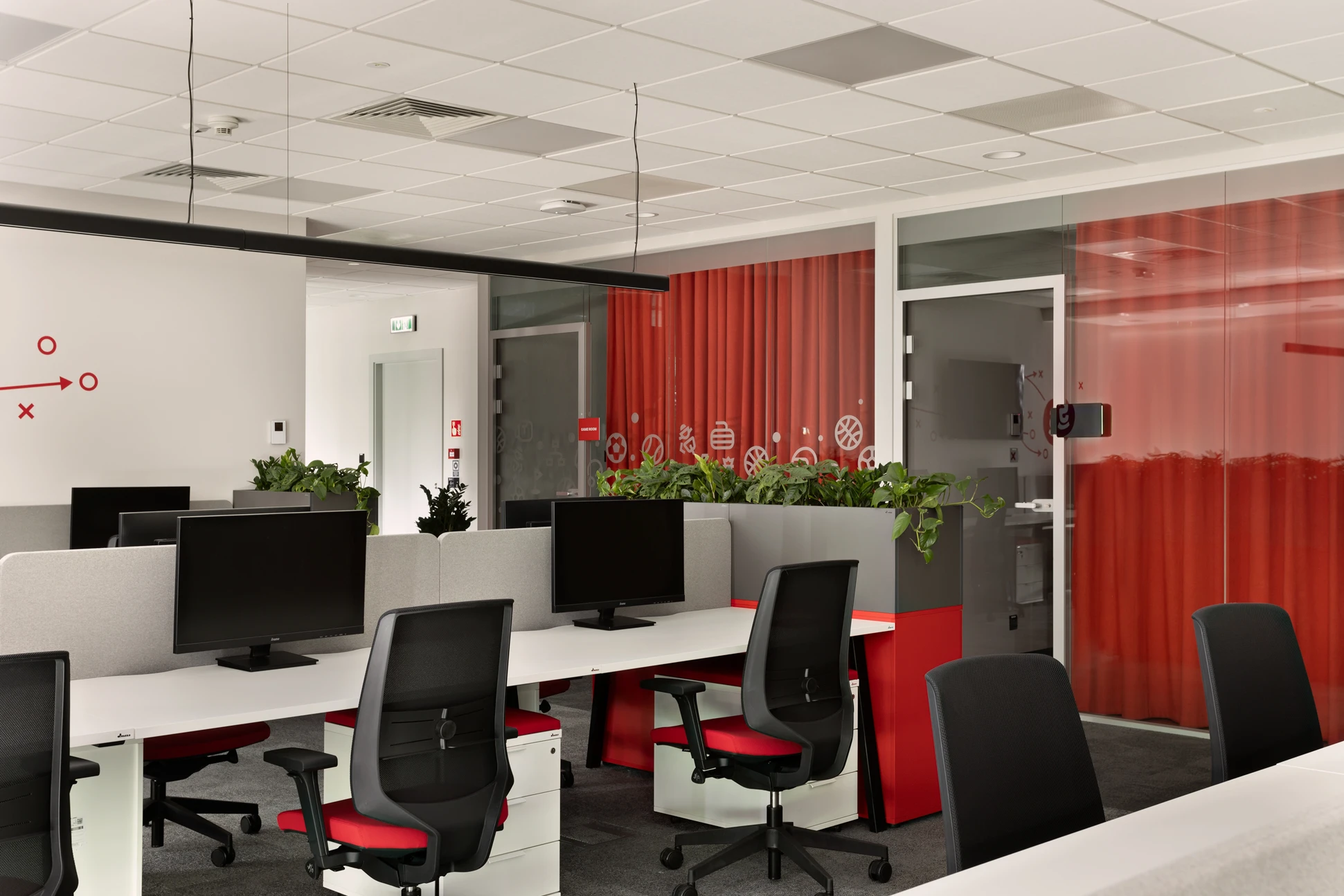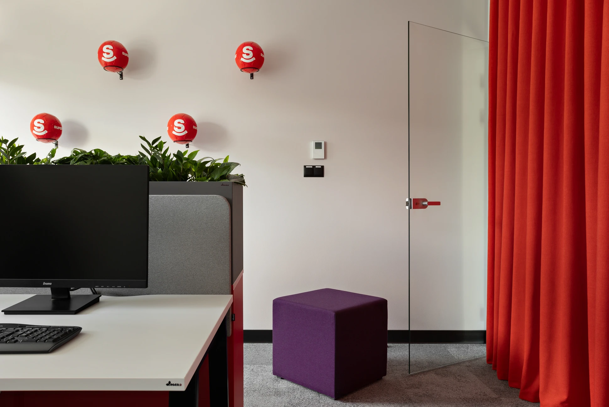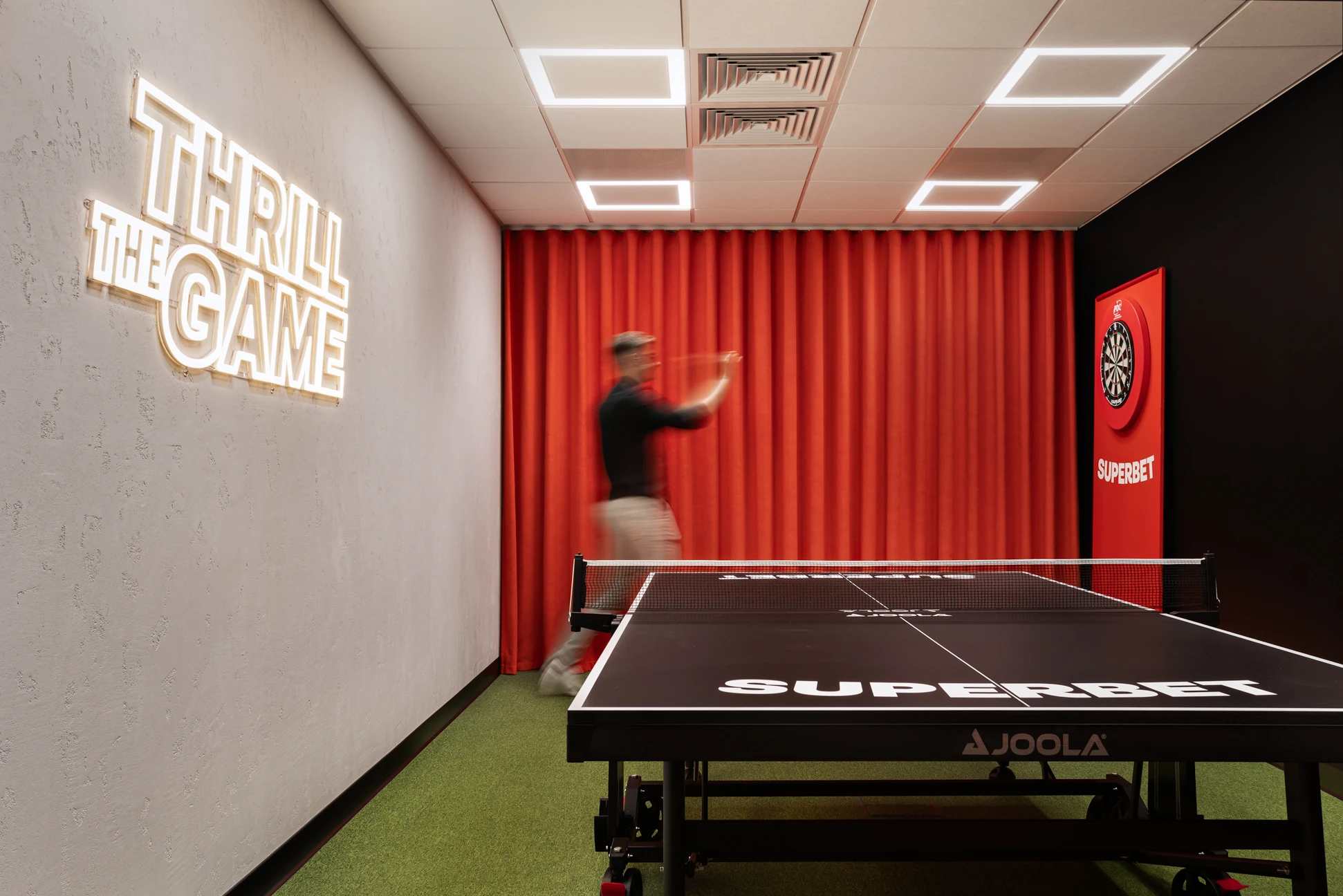 Ciekawym akcentem są grafiki – nie tylko na ścianach, ale również na blatach stołów i frontach szaf, które wzmacniają wizualną tożsamość marki. Dominującym motywem kolorystycznym jest czerwień – kolor logotypu Superbet, subtelnie przewijający się w różnych częściach biura.
