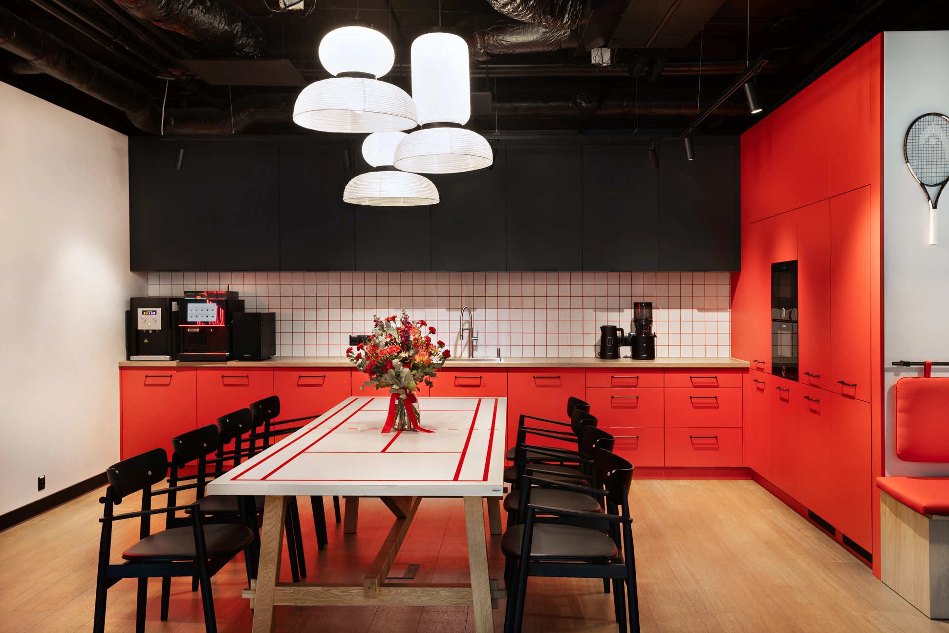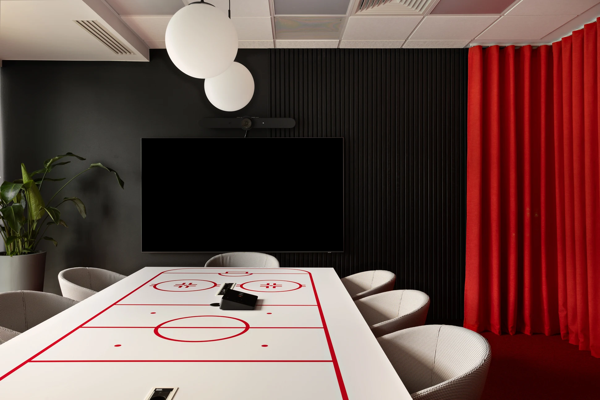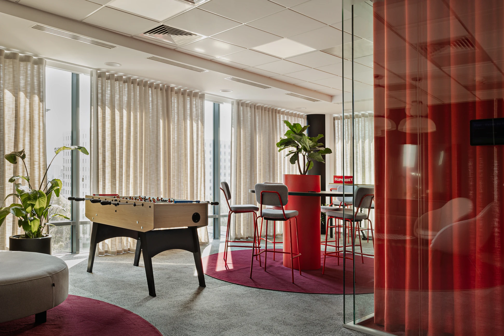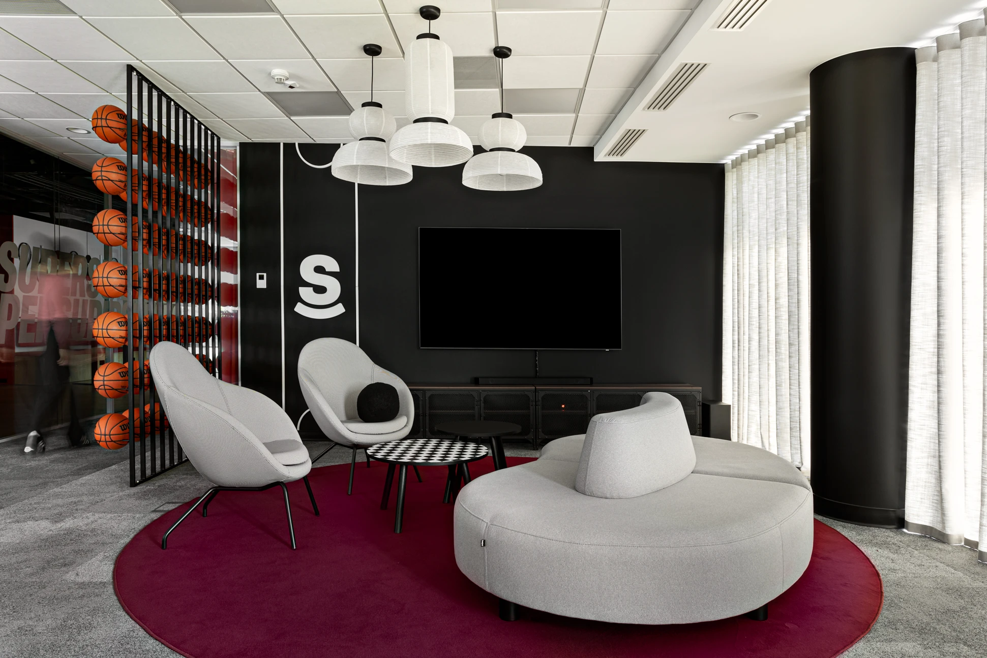 Ciekawym akcentem są grafiki – nie tylko na ścianach, ale również na blatach stołów i frontach szaf, które wzmacniają wizualną tożsamość marki. Dominującym motywem kolorystycznym jest czerwień – kolor logotypu Superbet, subtelnie przewijający się w różnych częściach biura.